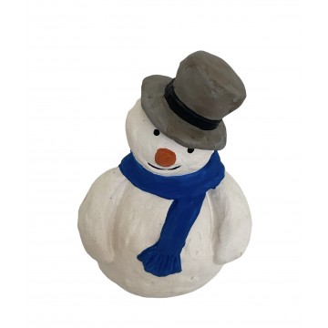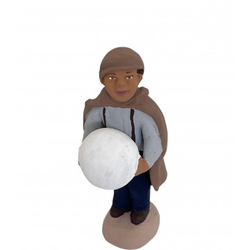 Petit garçon portant une cape tenant dans ses mains une grosse boule de neige