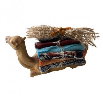 santon représentant un dromadaire couché chargé de tissus. Il est prêt pour accompagner le bédouin qui se rend sur le marché pour vendre ses tissus.