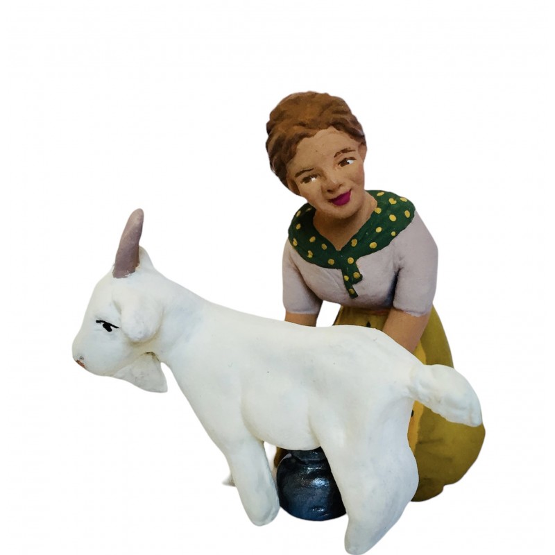 santon artisanal en argile cuite de Provence, 7 cm représentant une chevrière qui trait une chèvre.