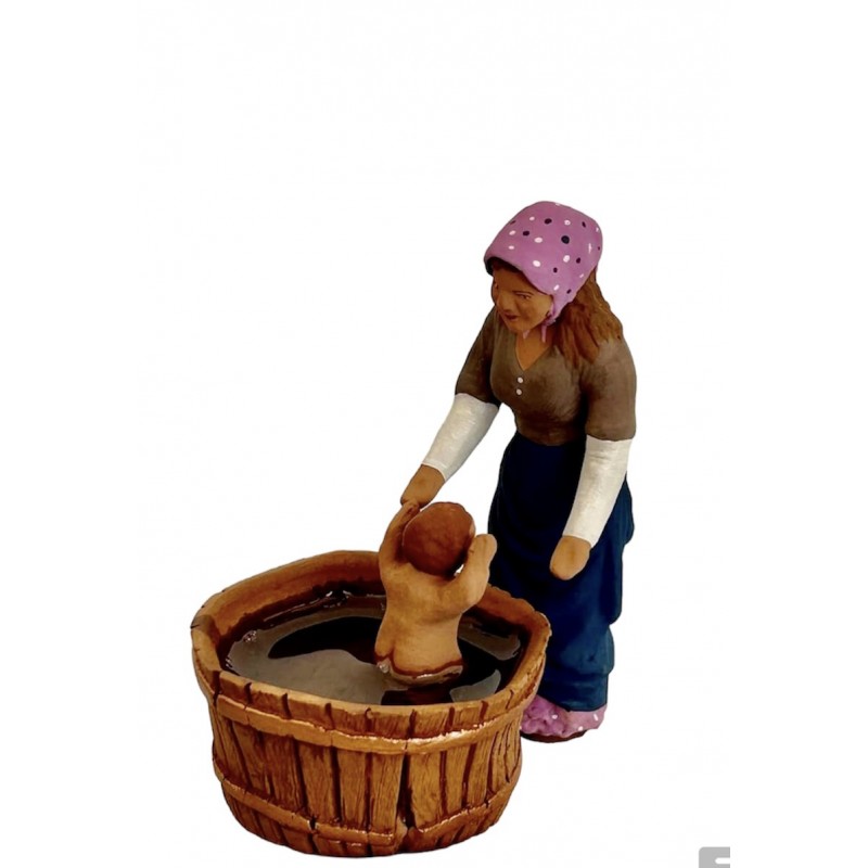 santon représentant une maman lavant son bébé , celui-ci se trouvant dans un baquet .