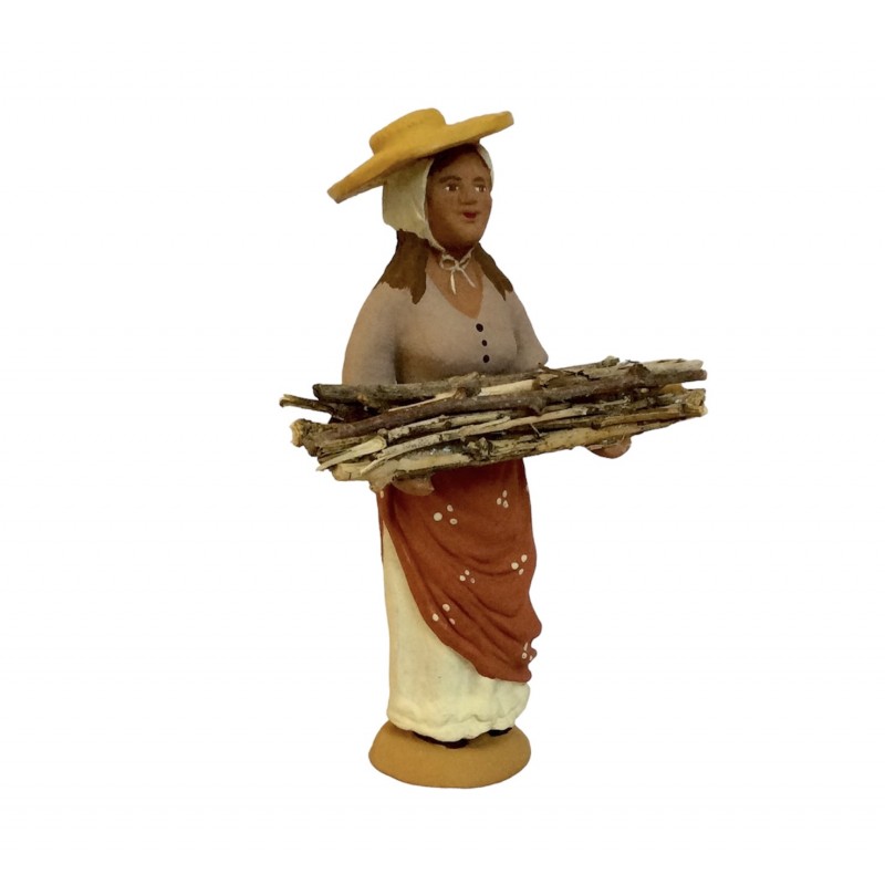 santon de Provence de fabrication artisanale en argile cuite et peint à la main , 9 cm, représentant une femme portant un fagot de bois . Elle est très élégante avec son chapeau sur la tête qui la protège du soleil.