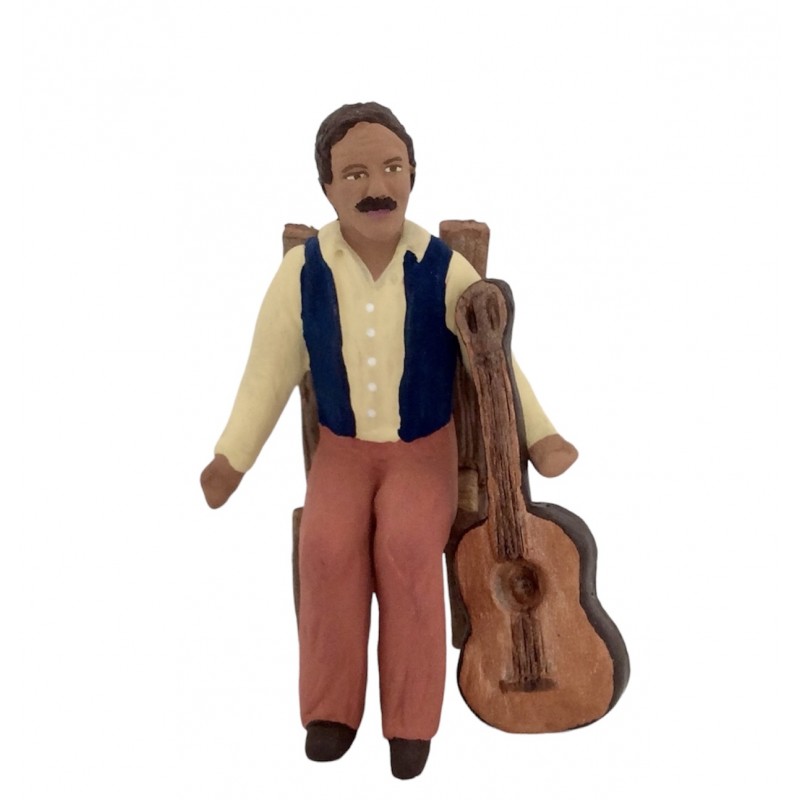 santon artisanal de Provence en argile cuite , 9 cm représentant un gitan assis ( chaise non fournie) une guitare posée à côté de lui .