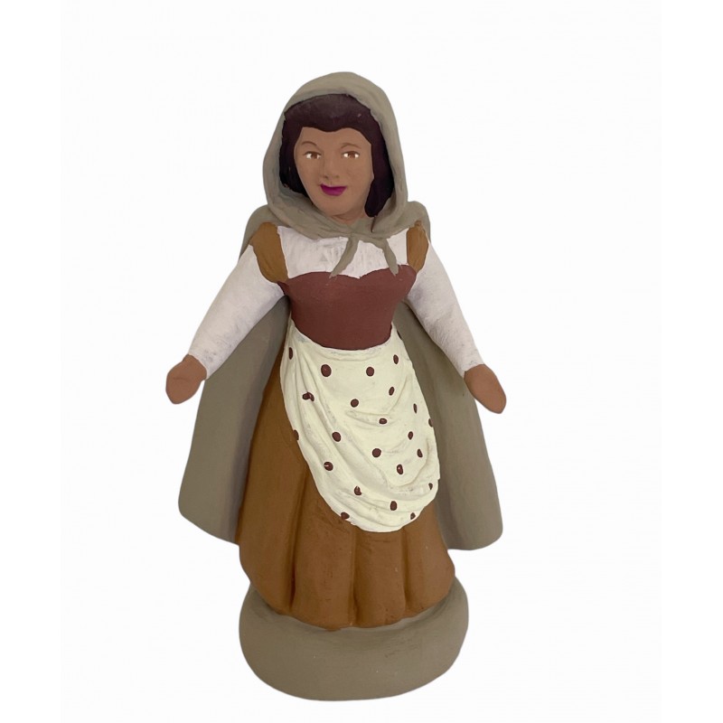 Santon artisanal de Provence en argile cuite et peint à la main , 7 cm représentant une femme portant une cape .
